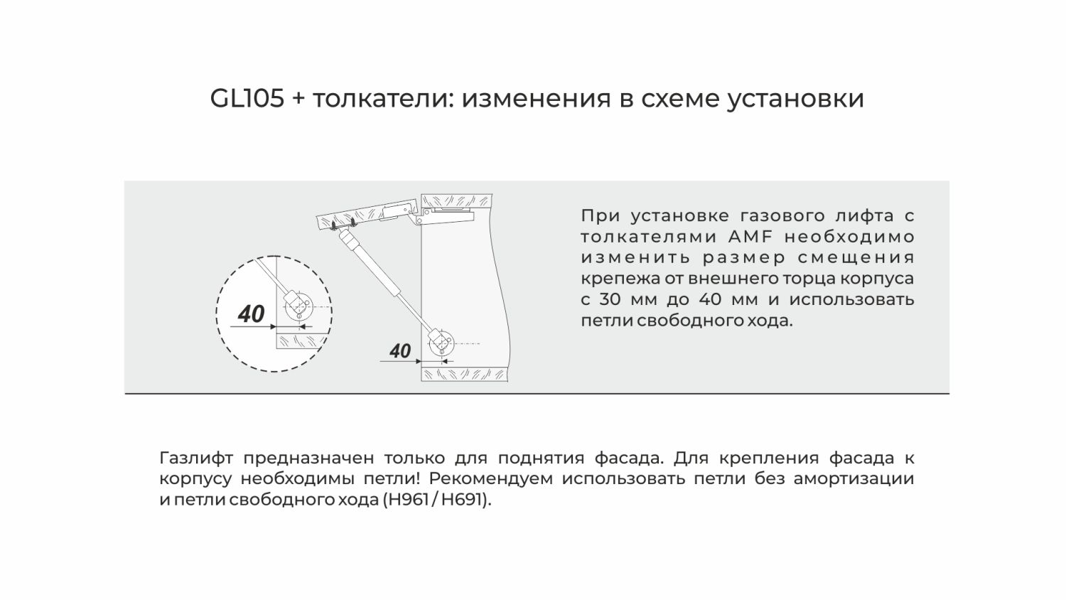 Для открытия от нажатия рекомендуется установка с толкателем (на выбор с AMF 10 по AMF15) и петлями Н961 или Н691. При таком варианте схема монтажа поменяется, необходимо изменить размер смещения крепежа с 30 до 40 мм. Эти изменения отражены в схеме в карусели фото карточки.