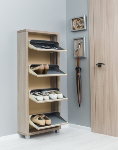 Многофункциональный, компактный и вместительный обувной шкаф “IRONNORI” работает по принципу веера, лотки которого открываются синхронно. Несмотря на свои скромные размеры, в шкаф помещается обувь всей семьи и даже гостей, это достигается за счет оригинальной и продуманной трансформации - лотки одновременно легко открываются и выдвигаются, позволяя выбрать обувь на сегодняшний день.