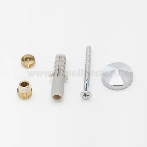 Крепление зеркала к стене через отверстие. Комплектация: декоративный элемент, латунная втулка с резьбой, пластиковые втулки под отверстия в зеркале 6 и 8мм, шуруп и дюбель.