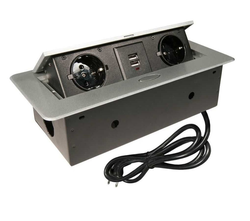 Блок розеток настольный 3 розетки 2xUSB без нижнего корпуса, с щёткой, алюминий, с проводом 1,5 метр
